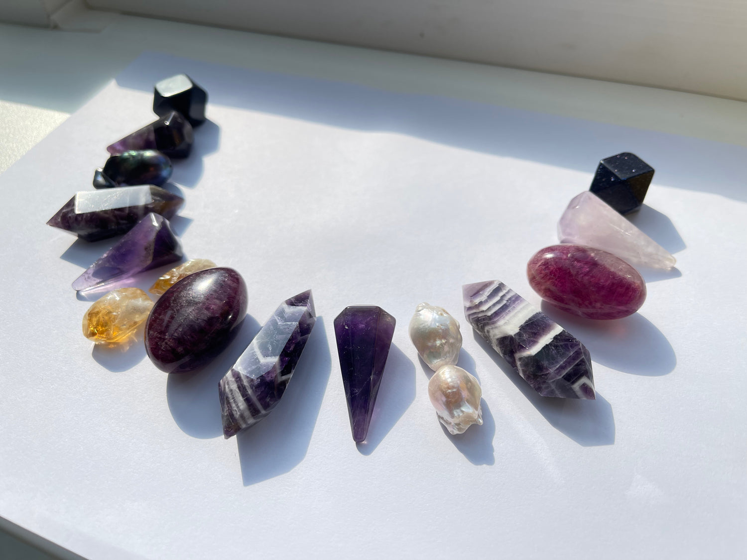 Necklace: morganite, rose quartz, pearls