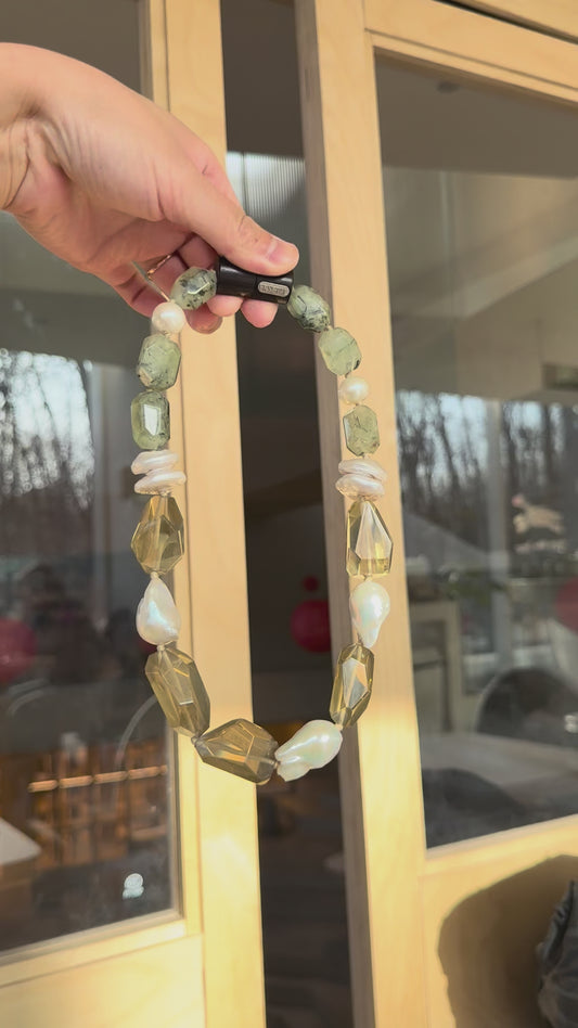 Necklace: pearls, citrine, prehnite, ebony