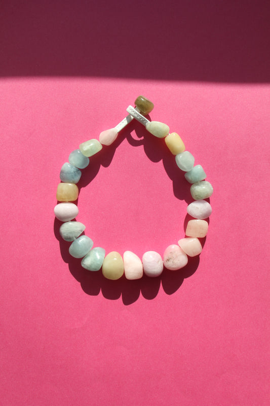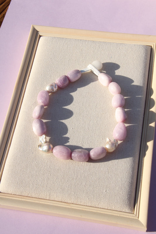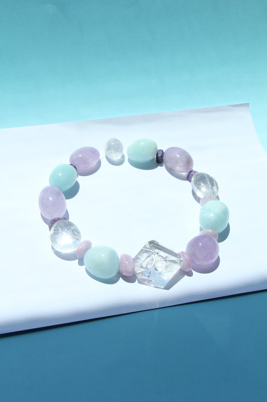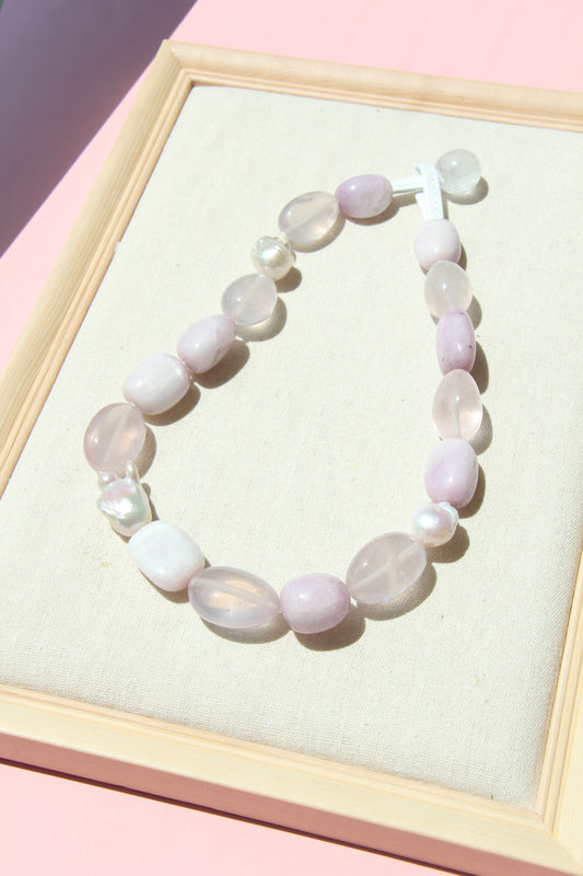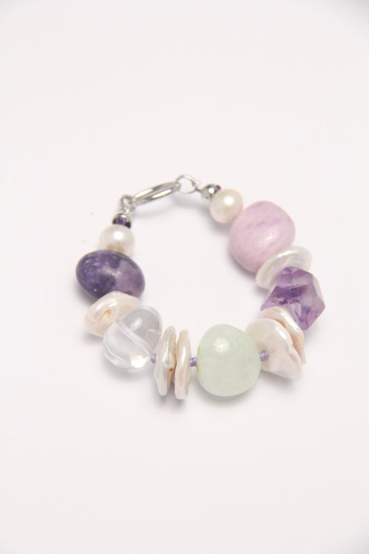 Bracelet: amethyst, kunzite, prehnite, lepidolite, quartz, pearls