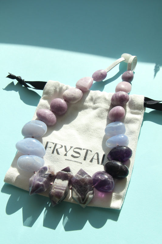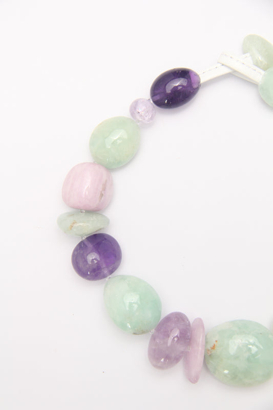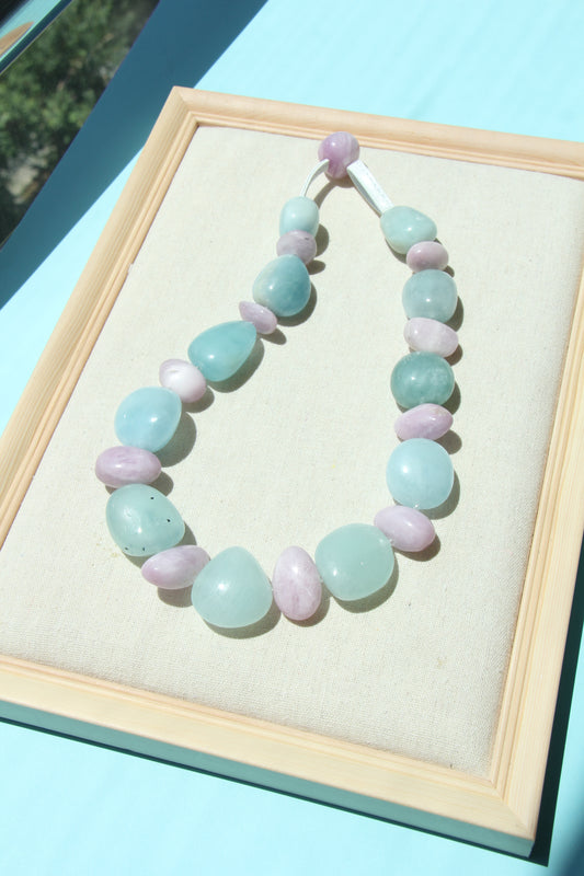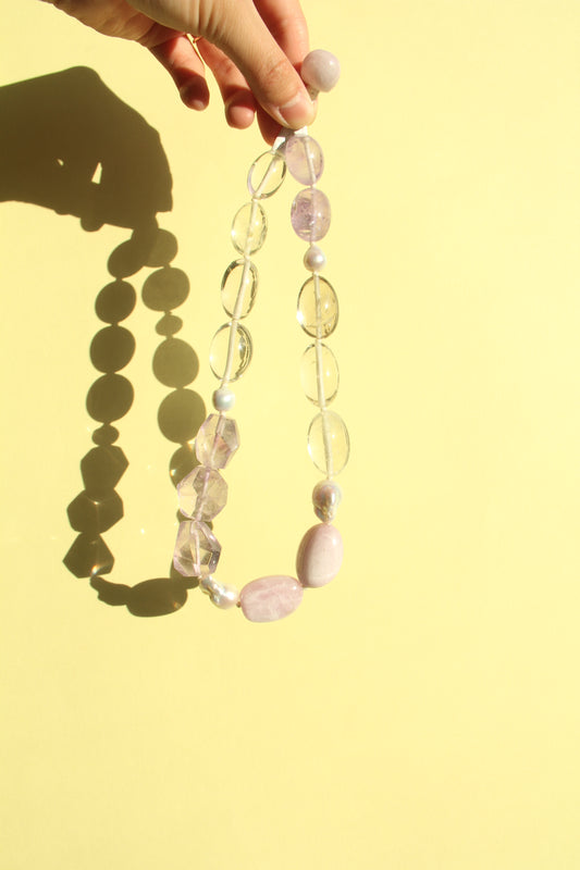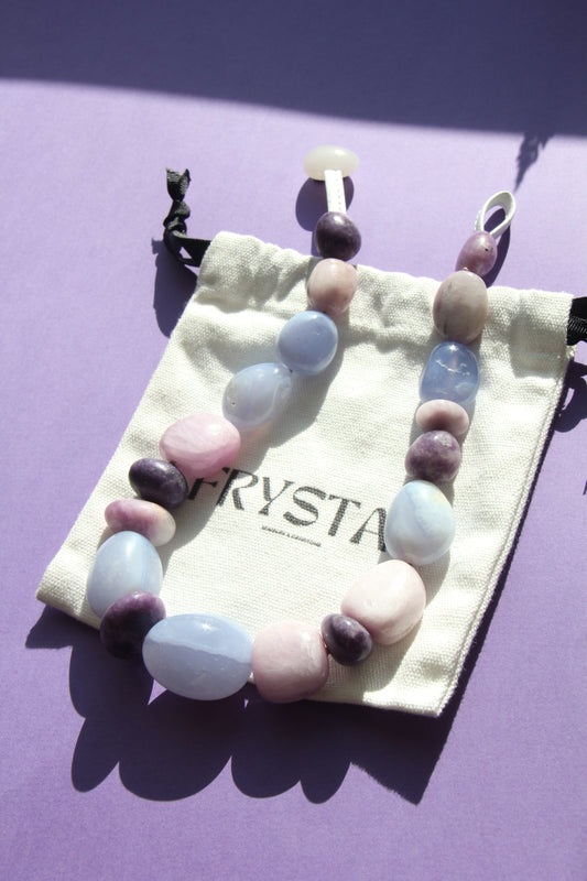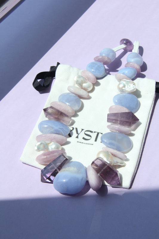 Necklace: dream amethyst, blue lace agate, kunzite, lepidolite