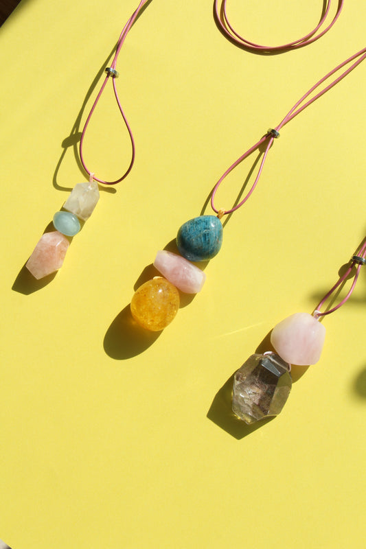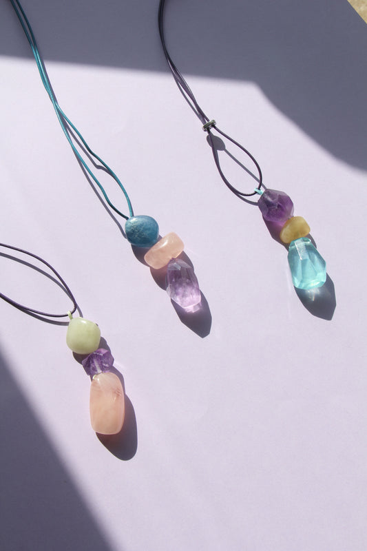 Necklace: quartz, obsidian, chalcopyrite, titanium magnet, herkimer diamond