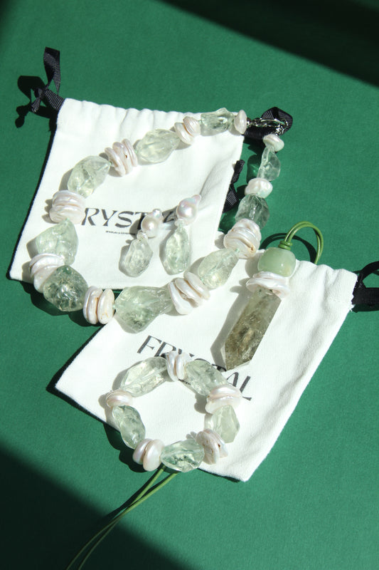• Necklace: prehnite, quartz, colored hematoid quartz