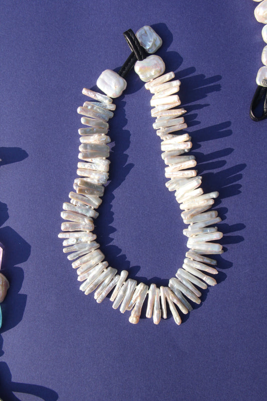 Necklace: amethyst stalactite flower flat slice, amethyst, pearls