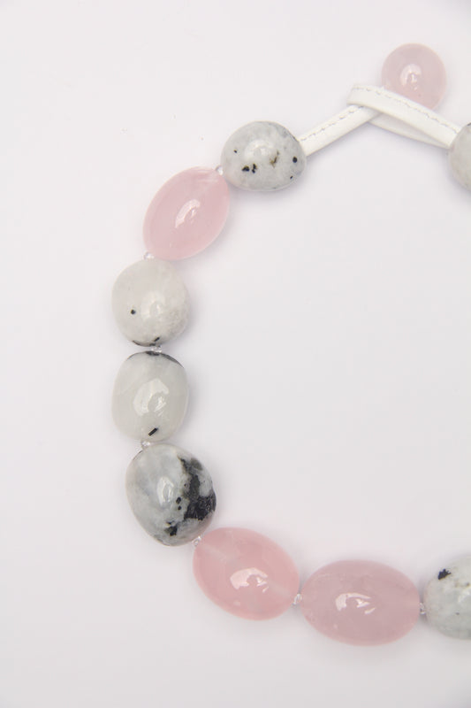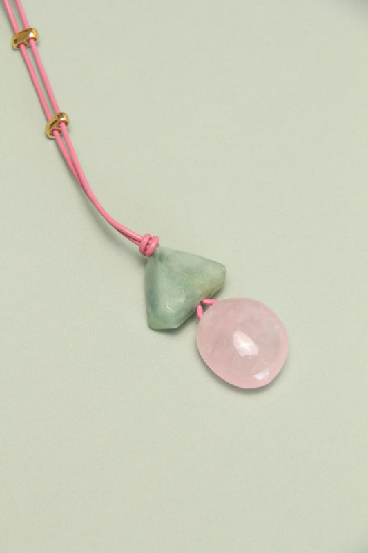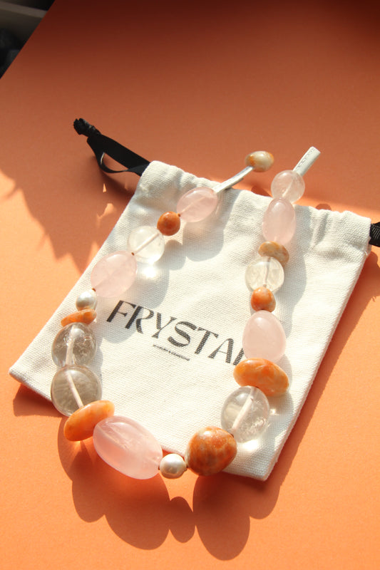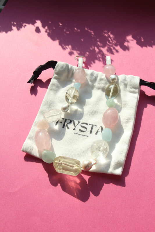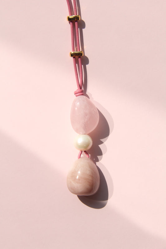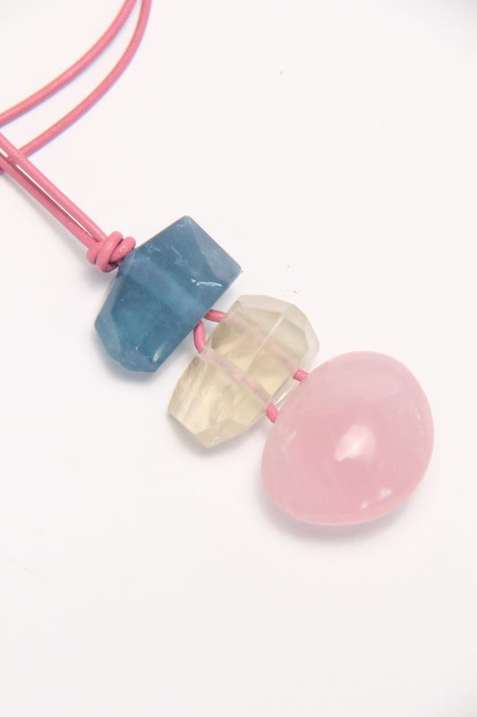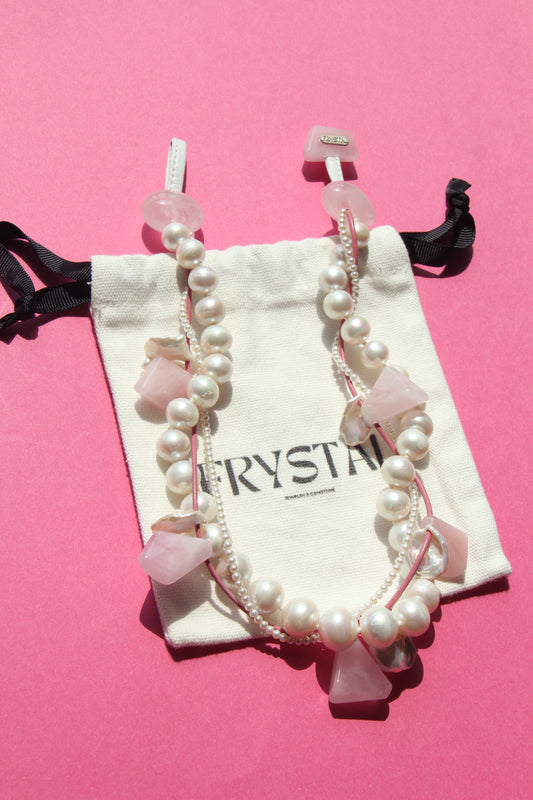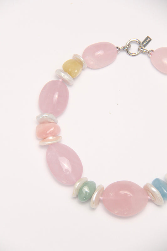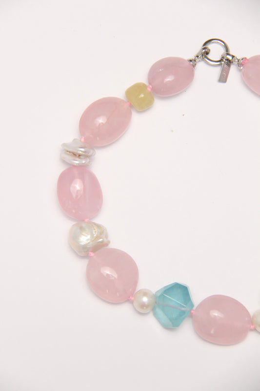 Necklace: rose quartz, aquamarine, pearls, morganite, phantom quartz