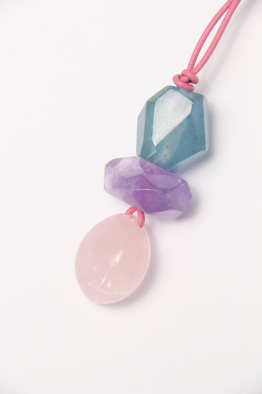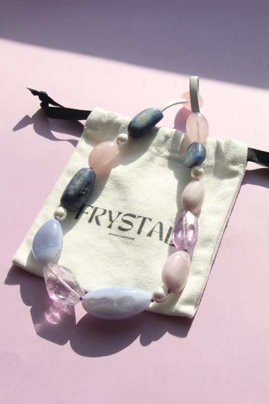Necklace: blue lace agate, amethyst, kunzite, kyanite, pearls