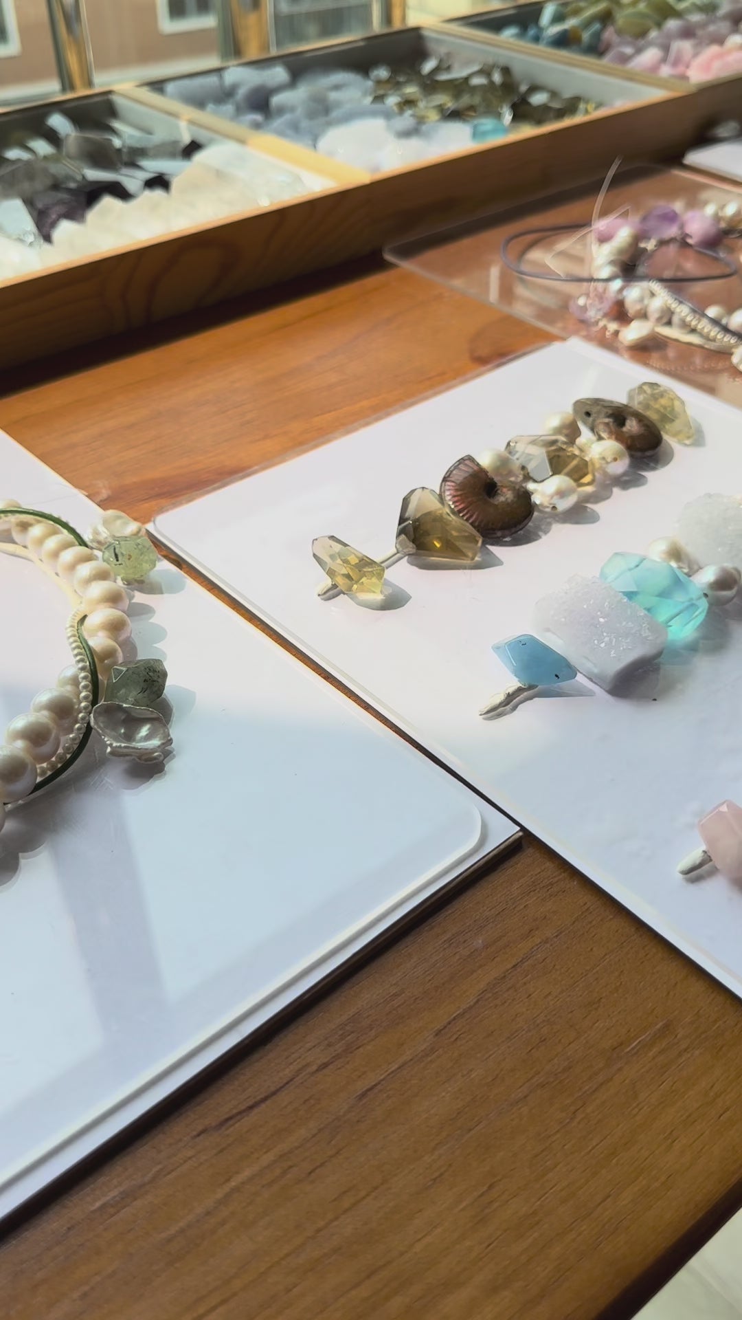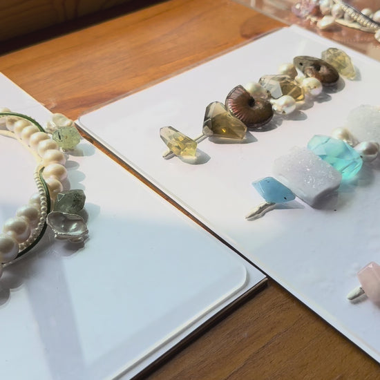 Bracelet: ammonite fossils, smoky quartz, pearls
