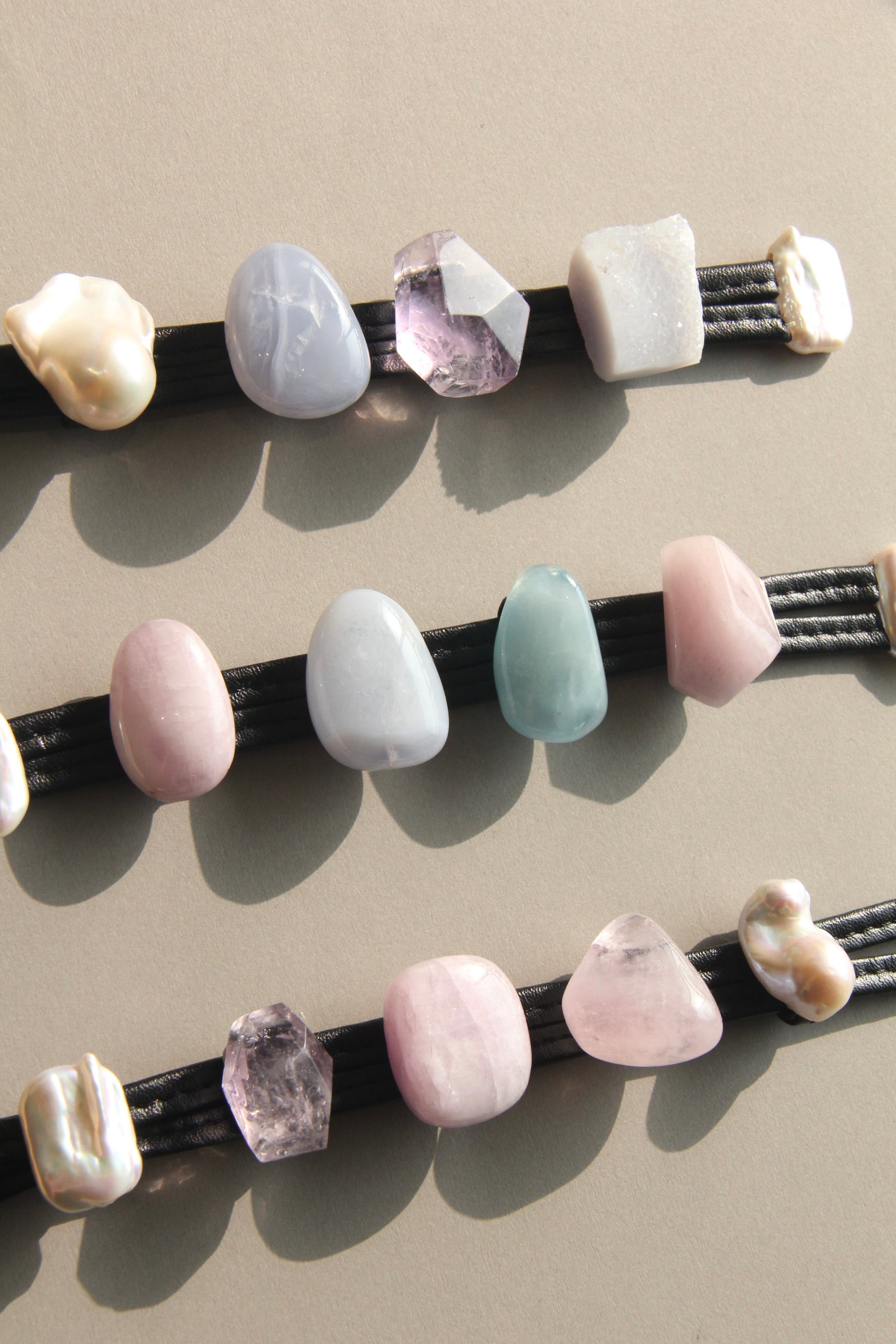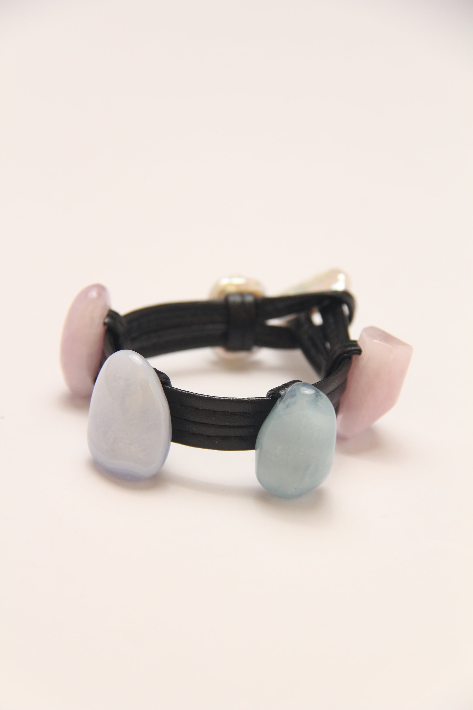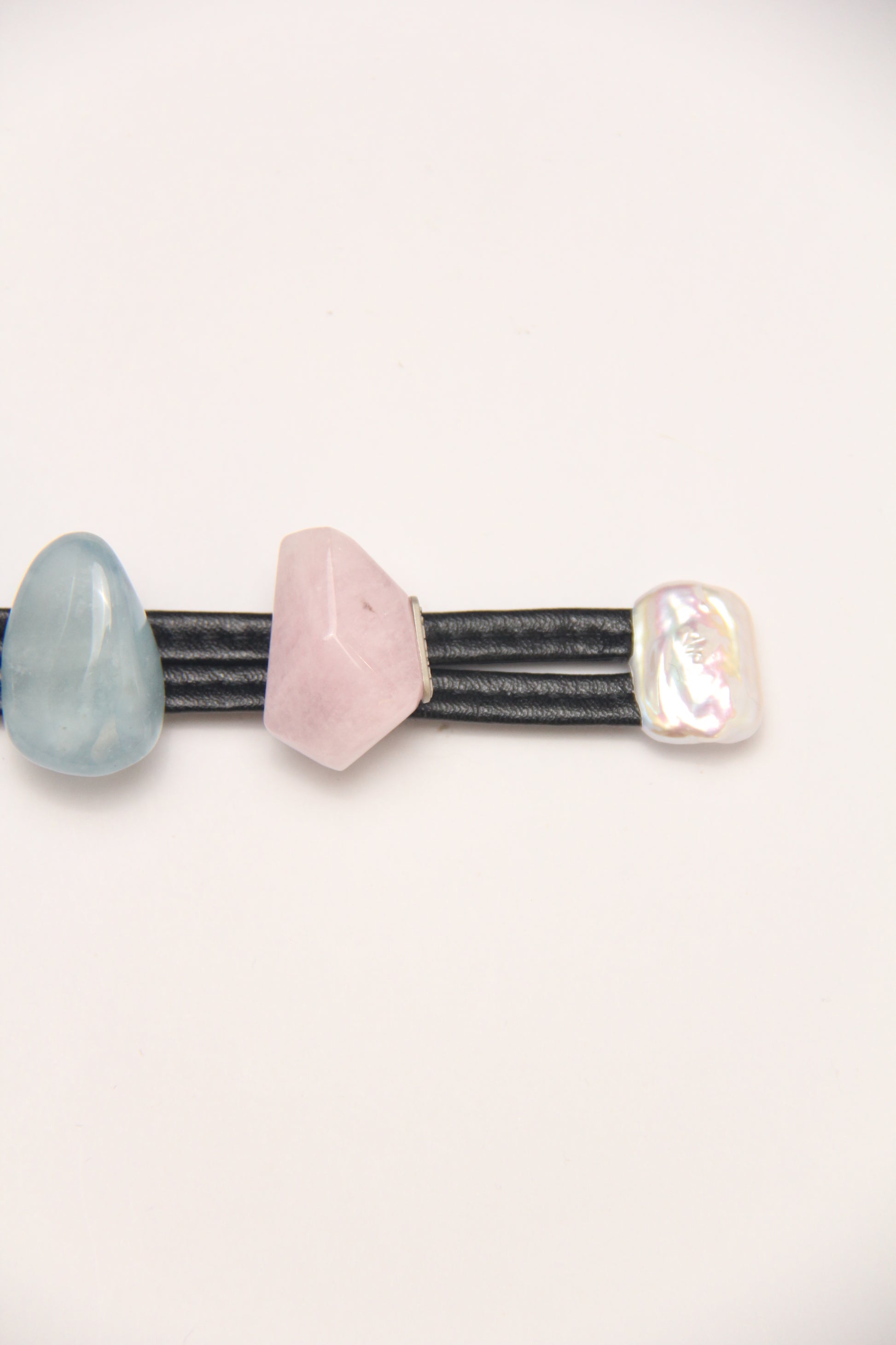 Bracelet: kunzite, blue lace agate, morganite, pearls