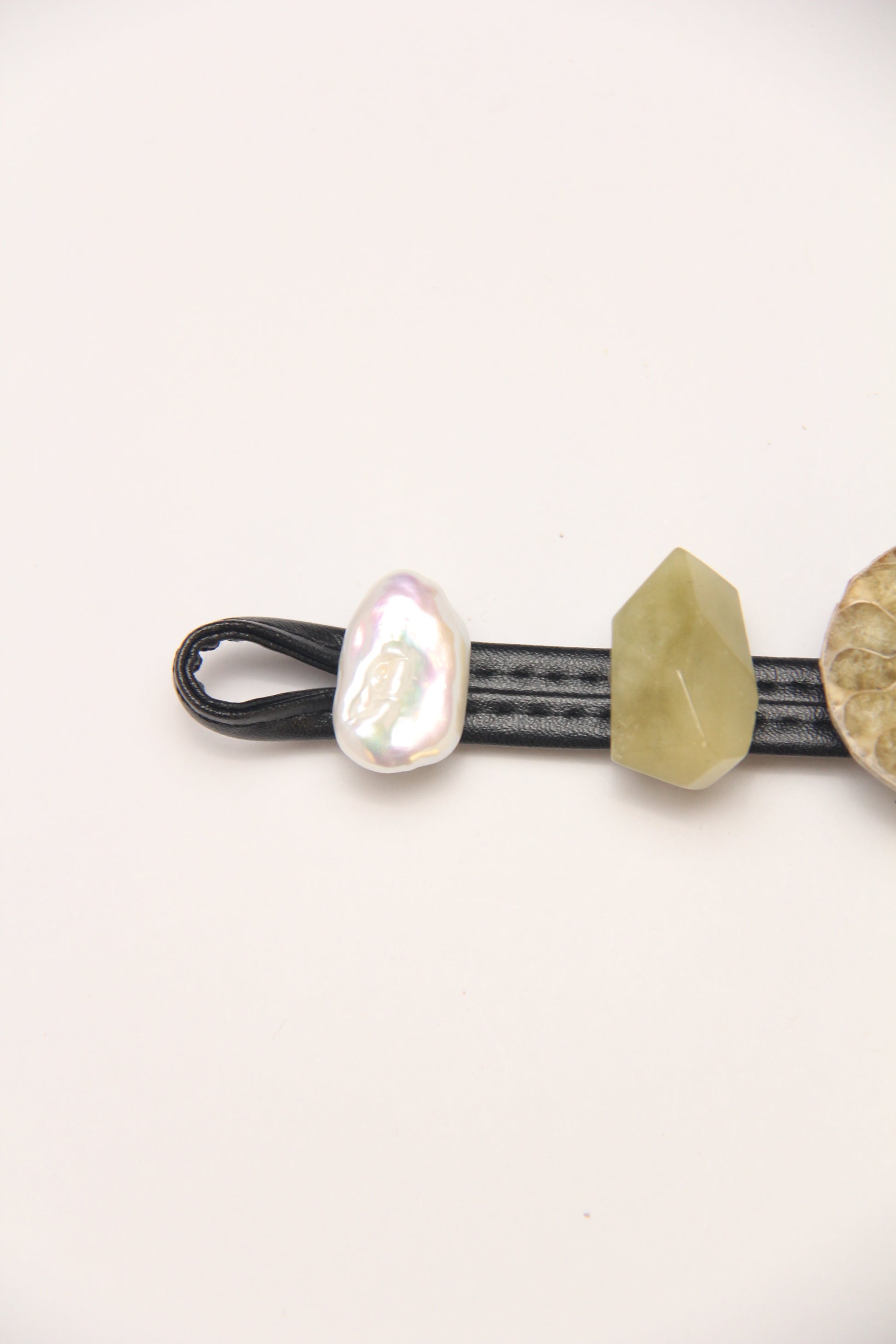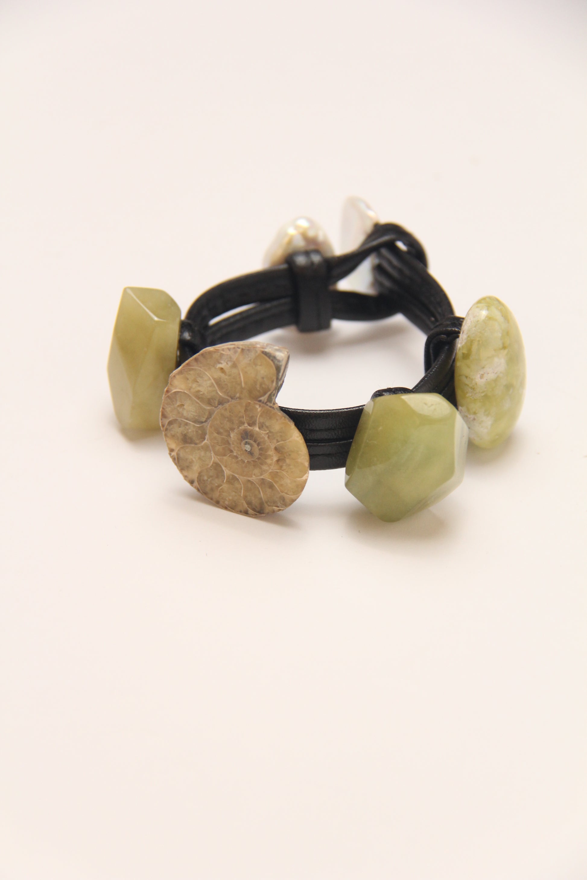 Bracelet: morganite, ammonite, golden prehnite, pearls