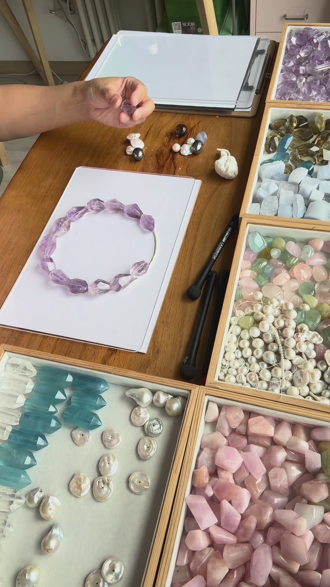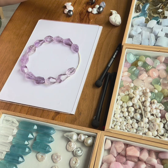 Necklace: blue lace agate, amethyst, pearls