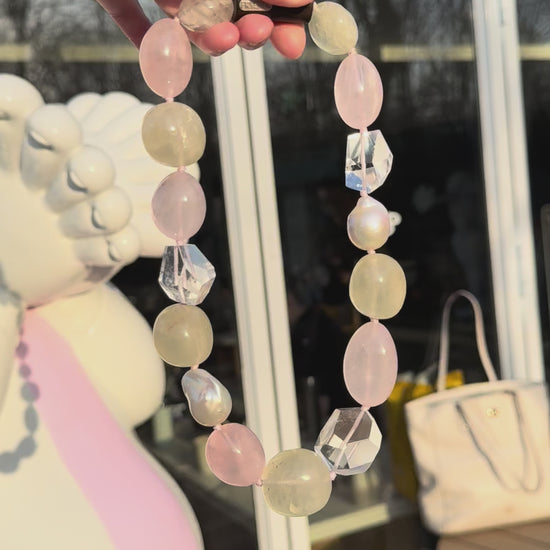 Necklace: pearls, citrine, rose quartz, quartz, ebony