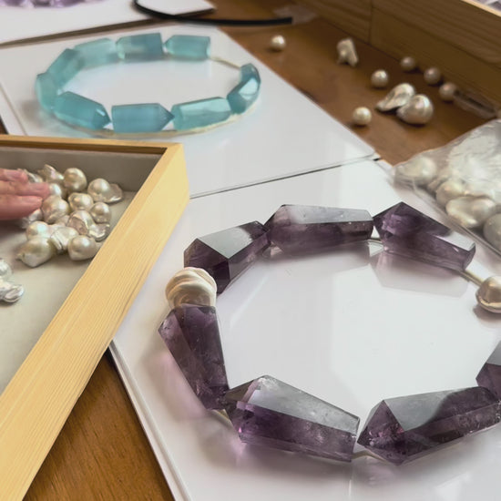 Necklace: prasem quartz, pearls