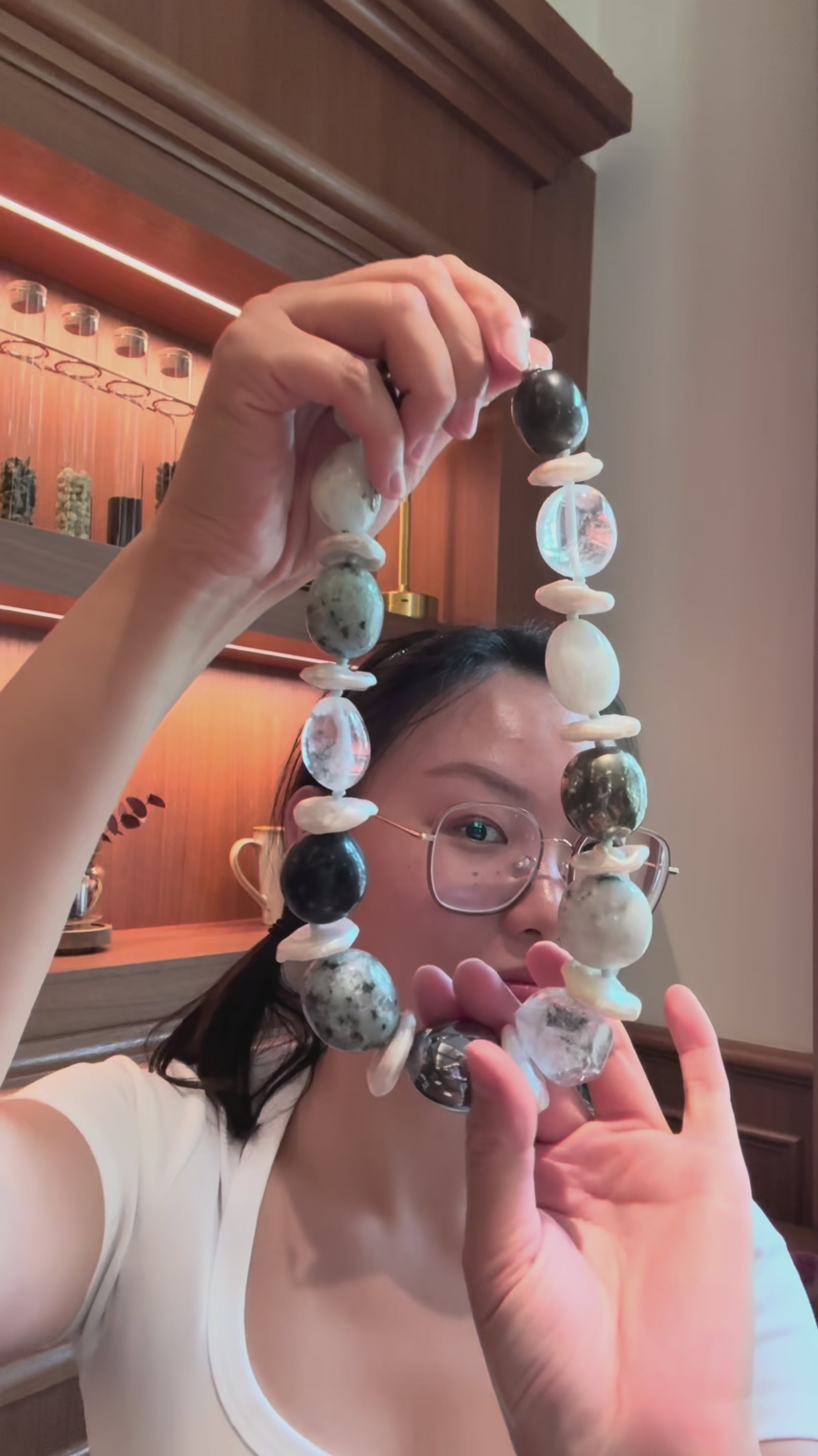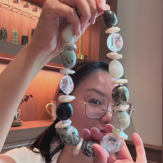Necklace: herkimer diamond, kiwi stone, obsidian, quartz, moonstone, titanium magnet